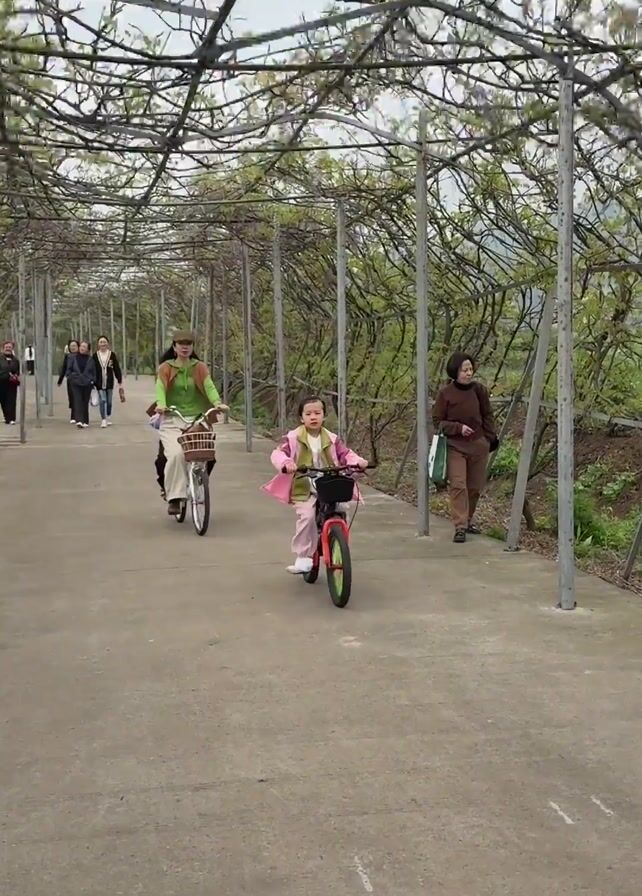 A gray concrete path runs through a park, where vines grow on a metal arbor overhead. A woman wearing green and brown rides a white bicycle down the path, carrying a child on the back. Behind her is a girl in a pink jacket riding a red bicycle. Behind the cyclists, a woman in brown walks down the path. Other people walk in the distance. The day is overcast. The cyclists move closer to the camera.
