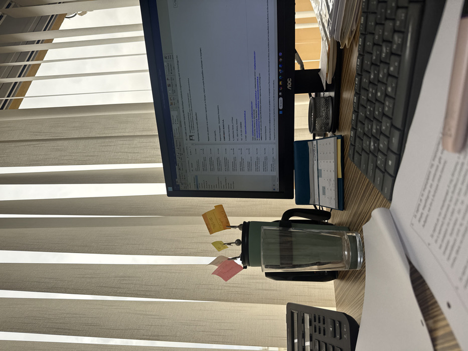 The image depicts an office workstation situated in Nicosia, Cyprus