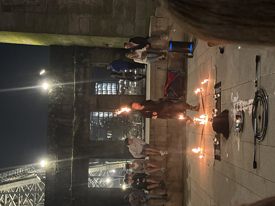 - "The image depicts a nighttime street performance in Porto, Portugal, specifically near the base of the Dom Luís I Bridge, the metallic truss structure of which is visible through a stone archway on the left" by FM-z4cUR2, licensed under CC BY 4.0