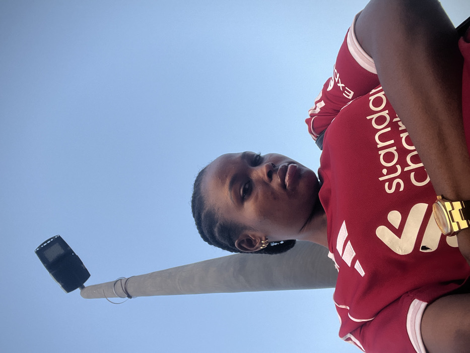 A woman wearing a red Liverpool FC jersey and a gold watch looks down at the camera. She is positioned next to a gray light pole under a clear, blue sky. The jersey features white "Standard Chartered" lettering, and the sleeves have white trim. The photo has an upward-facing perspective, emphasizing the sky and the light pole.