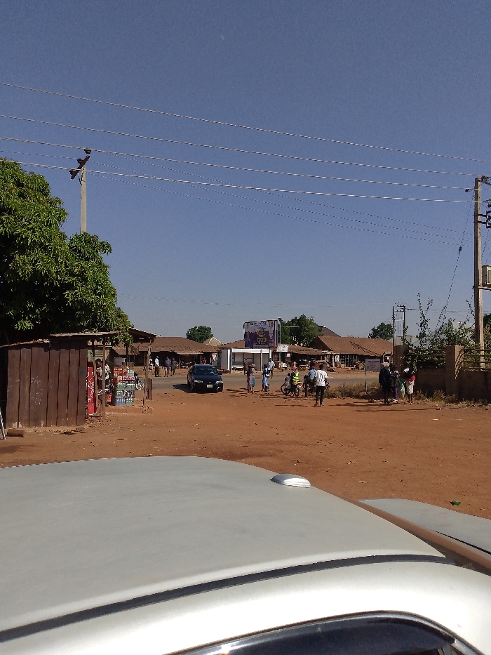 An unpaved, reddish-brown dirt intersection or junction is depicted under a clear blue sky, viewed from the interior of a silver vehicle, the roof of which occupies the bottom third of the frame. The specific city and country are undetermined. Approximately 15 to 20 individuals, including adults and possibly children, are present in the mid-ground, either standing, walking, or congregating in small groups across the unpaved area. Some individuals are near bicycles. A dark-colored sedan is positioned on the unpaved road in the center-left mid-ground. Structures line the perimeter of the intersection: A rustic, brown wooden stall or kiosk with bottled beverages displayed outside stands on the left. Numerous single-story buildings with corrugated metal roofs extend into the background, suggesting commercial or residential use. A building with a white facade is visible in the center-right background, above which a large billboard displays the word "GOLD" prominently. Infrastructure includes several utility poles. A tall, light-colored utility pole supports at least five overhead power lines spanning the upper frame. Another utility pole on the far right features additional wiring and what appears to be an outdoor air conditioning unit. Green foliage from trees and shrubs is visible on the left and right sides of the scene. Shadows indicate bright, direct sunlight.