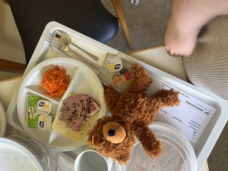 An overhead, slightly angled shot depicts a meal tray and its contents, resting on a light-colored table, within what appears to be a patient room in Bad Kreuznach, Germany