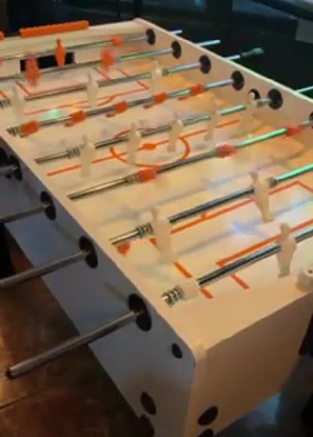 foosball table being played in a room with dim lighting. The table is white with orange and white foosball players. A person is sitting in the background, partially visible. There is a projected screen in the background showing a green and white image. The foosball game is in progress, with the ball being actively played. The table is resting on a dark surface, possibly a wooden floor.
