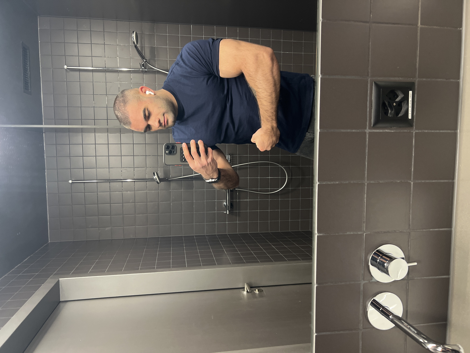 This image captures a muscular male taking a mirror selfie in a modern bathroom or changing room located in Basel, Switzerland. The male subject has a short buzz cut and visible stubble, wearing a dark blue short-sleeved t-shirt and dark trousers. He has a white wireless earbud in his right ear and a dark-strapped smartwatch on his left wrist. He holds a black iPhone with a triple-lens camera in his right hand, partially obscuring his face, while flexing his left bicep and looking downwards towards it. The environment, visible in the mirror's reflection, features walls covered in dark grey square tiles with light grey grout lines, extending to a dark grey or black ceiling. Two chrome shower systems, one with a fixed head and another with a handheld wand on an adjustable rail, are mounted on the tiled wall, each with corresponding mixer controls. To the left, a plain, light grey metallic door with a polished chrome handle and lock is reflected. In the foreground, below the mirror's edge, wall-mounted chrome sink faucets and a black Type J electrical outlet are visible on the tiled wall. The outlet features three round holes, characteristic of Swiss sockets, and displays white text: "OV.E.UI.00 Allg. 280FI," confirming the Swiss location. The setting suggests a clean, functional, and contemporary facility.
