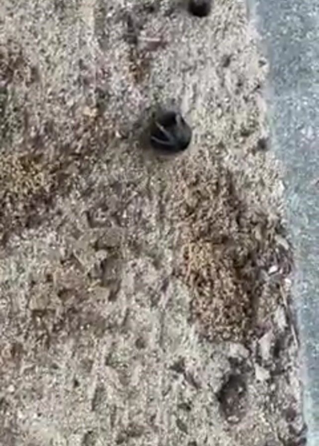 A close-up, high-angle shot shows a small, dark, spherical object resting on light-colored sand or soil. Several small holes are visible in the soil nearby, as well as some wet or discolored patches. A smooth, light-colored surface, possibly concrete, appears in the upper right corner of the frame. There are no people visible in the video. The camera remains stationary throughout the shot.