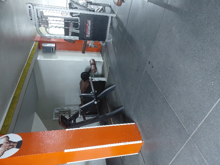 A gym's corner displays various exercise machines. A lat pulldown machine is visible in the background, with a leg extension machine closer to the foreground. Both are situated on a dark-tiled floor, adjacent to a wall painted white with an orange stripe. The corner features an orange wall section with a silhouette of a bodybuilder. Overhead lighting illuminates the space.