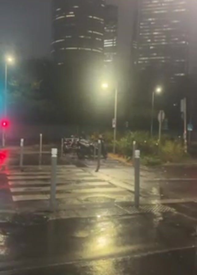 motorcycle lying on its side on a pedestrian crossing in a city. It is nighttime and raining, with puddles visible on the ground reflecting the lights from nearby street lamps. The traffic light visible is switching from red to green. In the background, there are modern skyscrapers illuminated against the dark sky. The camera is close to the ground and moves slightly, possibly indicating the person recording is walking.