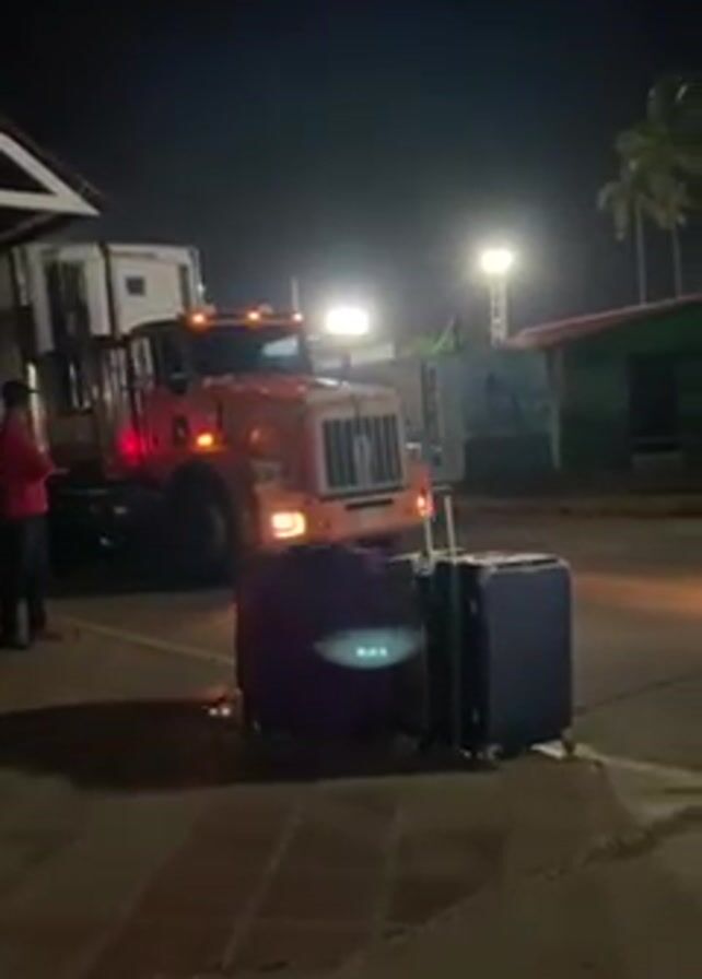 brightly lit nighttime scene featuring a large orange semi-truck with a white refrigerated trailer, parked in what appears to be a roadside or border area. Three pieces of luggage—a purple suitcase, a black suitcase, and a blue suitcase—sit in the foreground. A person dressed in a red shirt stands near the front of the truck on the left. A small building marked "Oficina" (office) is visible on the right. The truck idles, its headlights on and red lights illuminated on the cab. The environment includes a paved surface and palm trees in the background.