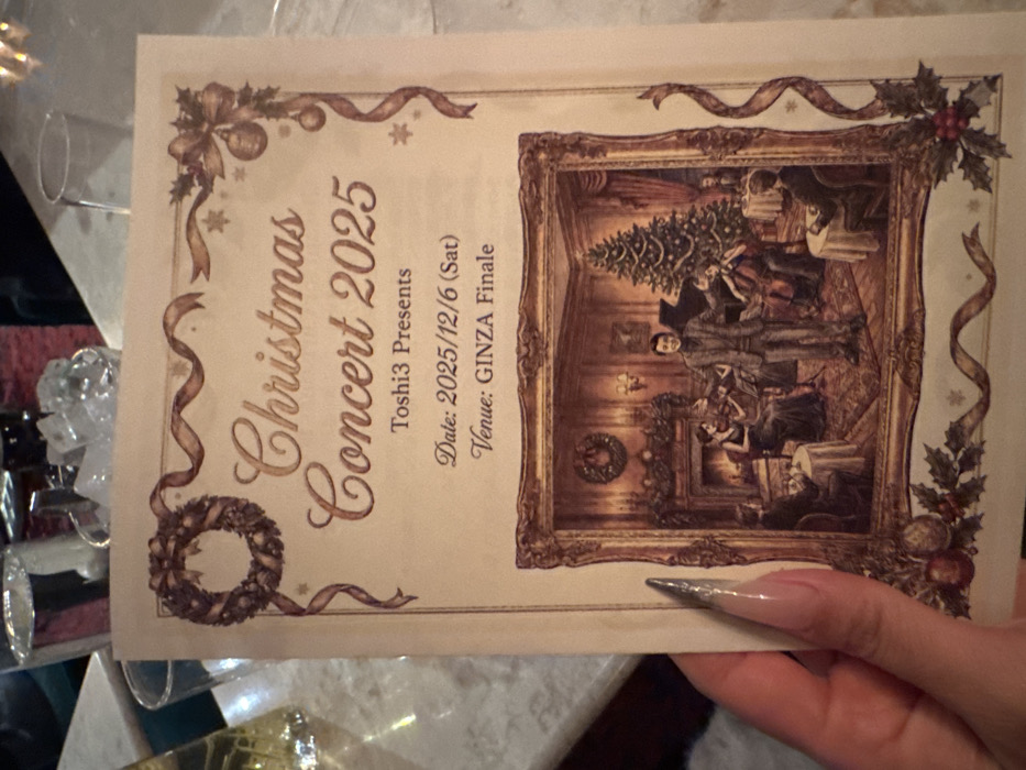 A human hand, with long fingernails featuring a silver glitter gradient tip, holds an off-white flyer titled "Christmas Concert 2025." The flyer, presented by "Toshi3," indicates the event date as "2025/12/6 (Sat)" and the venue as "GINZA Finale." The Ginza Finale is located in the city of Chuo, Japan. An illustration on the flyer depicts an indoor Christmas scene within a framed border, showing a male vocalist performing center-stage with string musicians (violinist, cellist) and a pianist near a decorated Christmas tree. Audience members are seated at small tables, and a fireplace with a wreath above it is visible in the background. The flyer's borders are adorned with festive Christmas decorations, including wreaths, ribbons, holly, and ornaments. The scene is illuminated by ambient lighting, with several glasses, one containing ice and another containing a yellowish liquid, visible on a light-colored surface in the out-of-focus background.