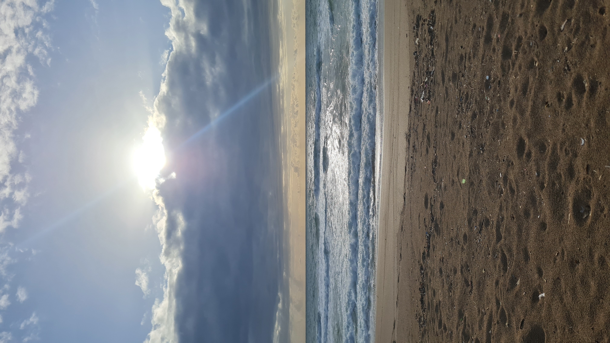 The image presents a scene at a beach in Nahariyya, Israel. The sky is partly cloudy with the sun shining brightly. The beach has sand and water. The water is choppy.
