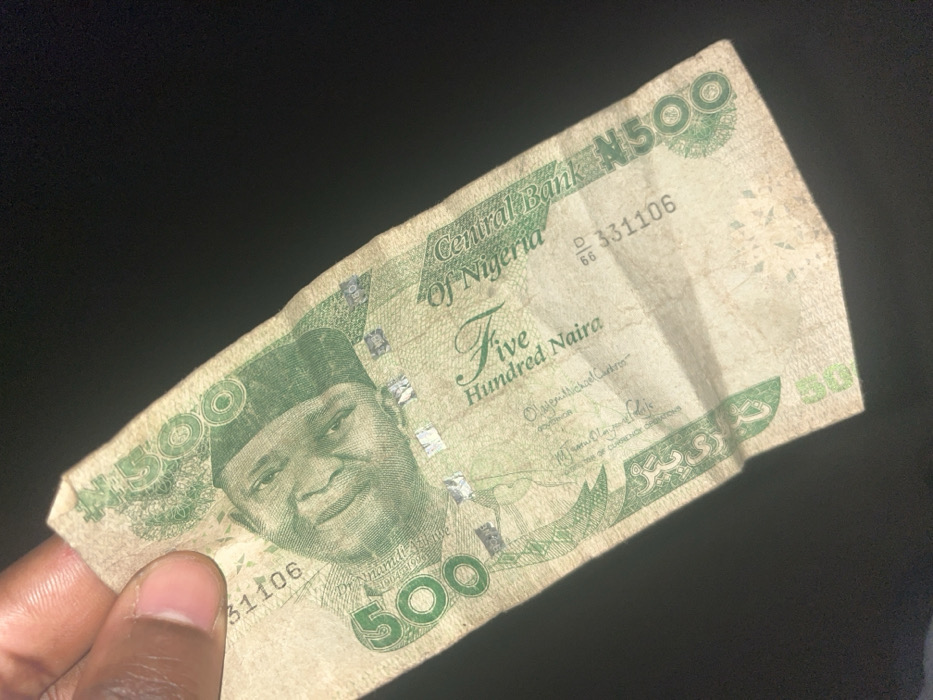 A slightly crumpled 500 Nigerian Naira note features a portrait of Nnamdi Azikiwe wearing a traditional cap