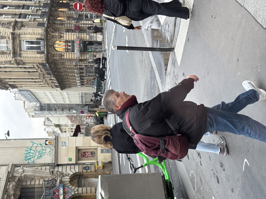 The image depicts an urban street scene in Paris, France, on an overcast day, characterized by visible wet patches on the asphalt pavement. The location is identifiable by a classic "METRO" station entrance sign and typical Haussmannian architecture. In the immediate foreground, a middle-aged male with short gray hair, wearing a black jacket, a red neck warmer, blue jeans, and light grey athletic shoes, walks from left to right across the sidewalk. He is looking towards the right side of the frame and wears a maroon backpack. To his left, partially obscured, a female with light brown hair, dressed in a black jacket and blue jeans, stands beside a bright green cargo bicycle equipped with a large, light-colored front box. To the right, a female with curly reddish-brown hair, wearing a black jacket, dark flared jeans, and white sneakers, walks away from the viewer towards an intersection. She carries a cream-colored shoulder bag and a white plastic shopping bag in her left hand. The background features multi-story, ornate stone buildings. The building on the left includes the "METRO" entrance, green graffiti tags, and a small pixelated mosaic on its wall. A prominent corner building on the right displays large windows, some illuminated, and intricate architectural details. A black compact car is visible at the intersection, along with a red 'STOP' sign, a green traffic signal, and distant pedestrians and vehicles. A black bollard stands on the sidewalk near a pedestrian crosswalk.