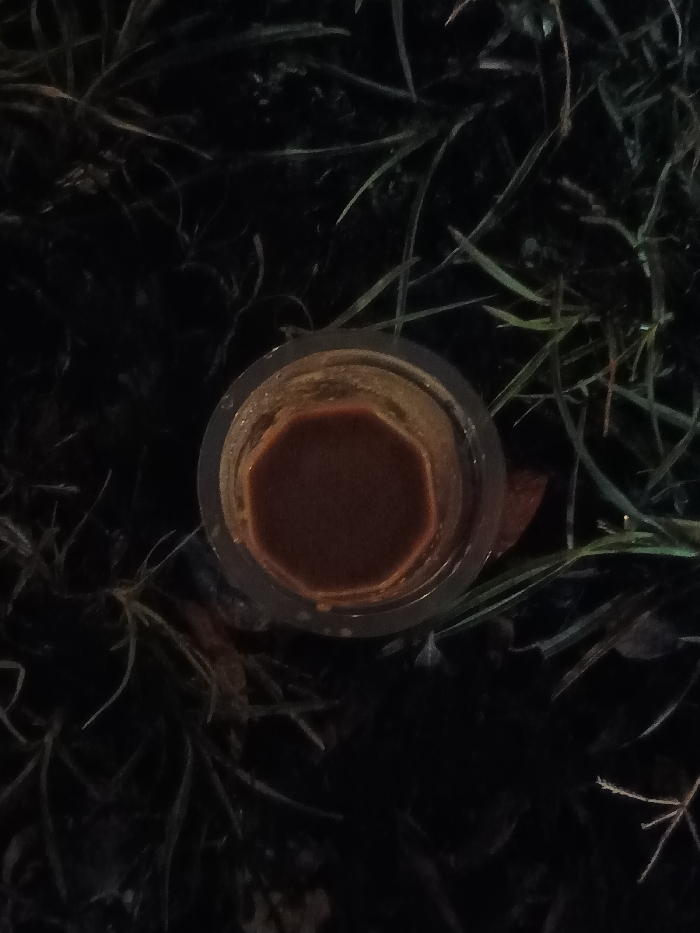 The image displays a clear, cylindrical vessel, approximately 7-8 cm in diameter, positioned centrally from an overhead perspective. The vessel contains a dark reddish-brown substance, the surface of which exhibits a polygonal, possibly octagonal, shape due to optical properties or internal settling. This vessel rests directly on a dark, uneven ground surface sparsely covered with narrow blades of green grass and patches of dark soil or organic matter. The environment appears to be outdoors under dim lighting conditions. No individuals, observable actions, or interactions are present. The scene is located in an unknown city area within Indonesia.