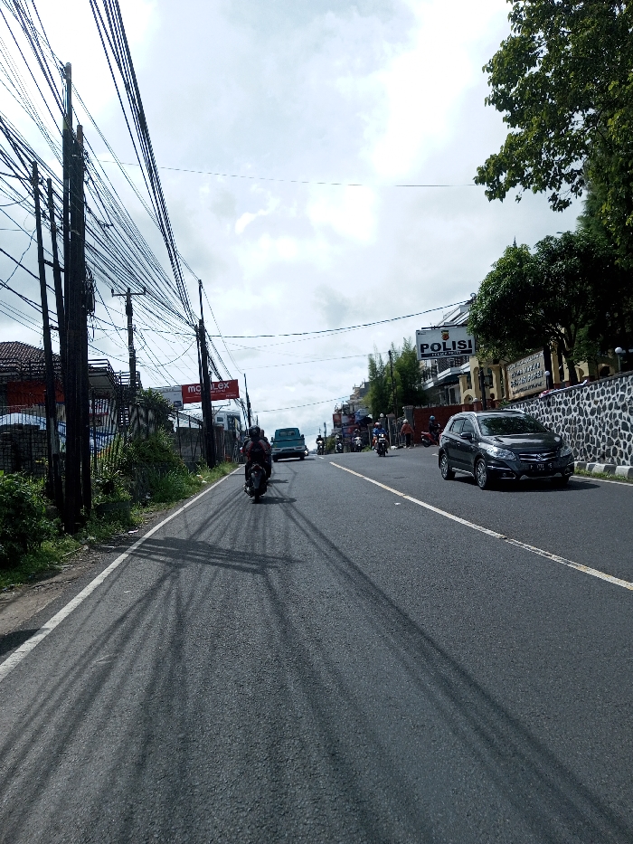 The scene depicts a road in the city of Taohom, Laos, observed under an overcast sky. The asphalt road features two lanes, marked by a broken white center line and a solid white line along the left edge. Long shadows from utility poles and overhead wires extend across the pavement from the left. On the left side of the road, multiple dark utility poles are densely strung with black electrical and communication cables. Behind them, dense green vegetation partially obscures a building with a red tiled roof. A white sign with red text, appearing to read "moBiLex", is positioned on this side. On the right side of the road, a dark grey SUV with Indonesian license plate B 1711 FZM is parked, facing the camera. Behind the SUV, a dark stone wall with a flat cap separates the road from a building. This building displays a prominent sign with the word "POLISI" (Police) in white capital letters on a dark background, accompanied by an emblem. Below it, a smaller sign reads "Jalan W.R. Supratman". Mature green trees are visible above and behind the wall and building. Vehicular traffic includes a person on a dark motorcycle, wearing a helmet, traveling away from the camera in the left lane. Further down the left lane, a light blue pickup truck proceeds. In the distance, multiple additional motorcycles and at least one other car are visible, traveling away from the camera. Several pedestrians are also present on the right shoulder further down the road.