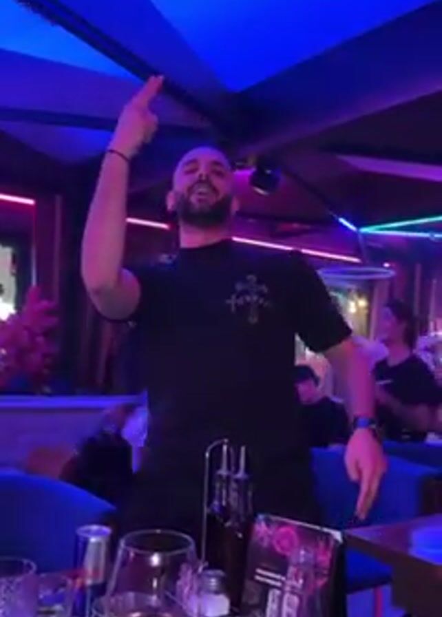 A man with a shaved head and a beard is dancing and singing in a restaurant. He is wearing a black t-shirt with a cross on it and a watch. He is standing at a table with drinks and other people around. The restaurant has blue and purple lighting.