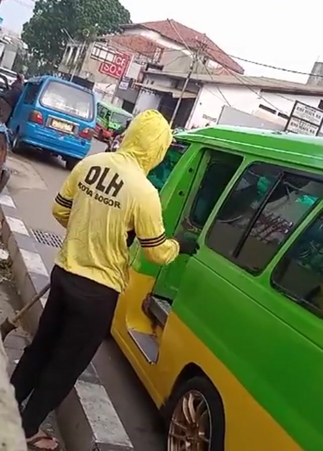 man wearing a yellow hooded jacket and black pants sweeping the road next to a parked green and yellow minivan. The man is standing on the curb and sweeping debris towards the minivan. The minivan is parked on the side of a road with other vehicles and buildings visible in the background. The jacket has the letters "DLH KOTA BOGOR" on the back. The license plate on the car reads "F 1955 CC". The side of the minivan has "CIBEUREUM" printed on it. Other vehicles, including a blue minivan and motorcycles, are on the road. Buildings and shops can be seen lining the street.