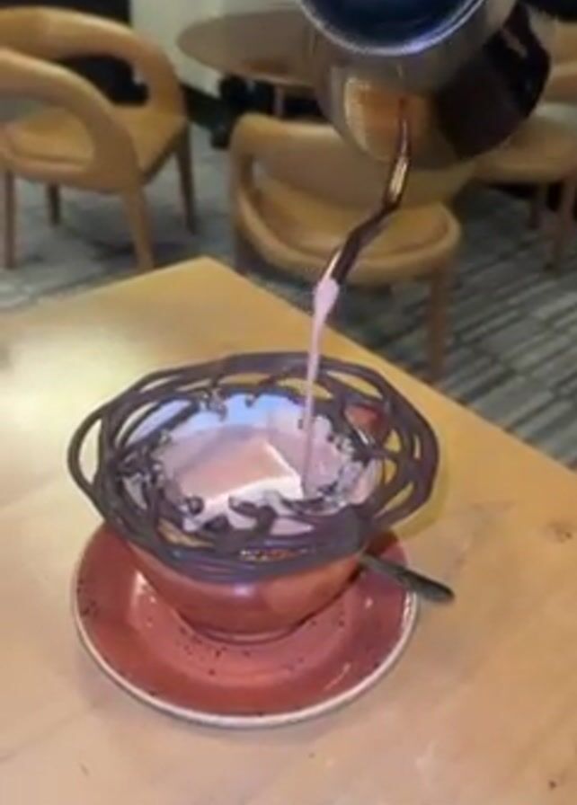 A shiny metal teapot pours a light pink liquid into a small, rustic-style bowl with a chocolate lattice rim. The bowl sits on a matching saucer, with a small spoon beside it. A cube of something white is partially submerged in the liquid. The table is light-colored wood. In the blurred background, several wooden chairs and small round tables are visible, suggesting a cafe or restaurant setting.