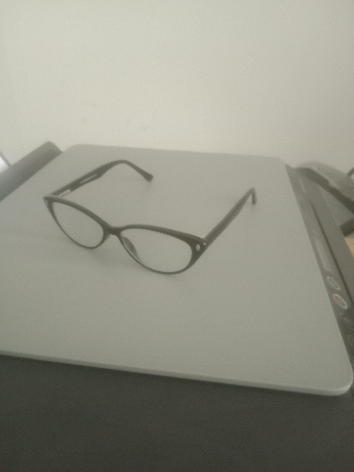 A pair of black, cat-eye style eyeglasses with clear lenses and two small, round, silver-colored accents on the upper outer frame corners rests on a light gray, flat, rectangular surface. The eyeglasses are positioned at an angle, with the left temple visible and the right temple partially obscured, both folded inward. The light gray surface appears to be the lid of an electronic device, such as a scanner or multifunction printer, with a dark housing and a control panel featuring two oval-shaped buttons visible on its right side. Below the light gray surface, a darker gray or black surface is visible. The background consists of a plain, light-colored wall. No individuals, actions, or interactions are present. The scene is static, indoors, and evenly illuminated. This scene is located in Gandu Albasa, Nigeria.