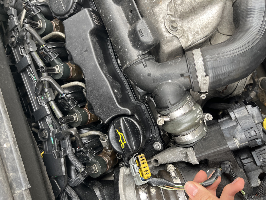 The scene depicts a detailed, top-down view within an open vehicle engine bay, located in Gara Oreshets, Bulgaria. The central subject is an internal combustion engine, primarily composed of black plastic components and grey metallic parts. Four fuel injectors with brownish bases and black tops are visible in the upper-mid section, interconnected by fuel lines and smaller black electrical connectors. A black plastic engine cover, partially obscuring the cylinder head, displays the inscription "Febi 19034". A black oil filler cap, marked with a yellow oil can symbol, is present on the lower-left. Various black rubber and plastic hoses are secured with metal clamps; one prominent ribbed hose connects to a black plastic elbow joint in the lower-right quadrant. A left human hand, with visible thumb and forefinger, is positioned in the lower-left, holding a disconnected yellow electrical connector with multiple exposed pins. Multiple insulated wires (brown, white, green, grey, black) are visible emerging from and taped together at the base of this connector. The engine components appear functional with some dust and minor residues.
