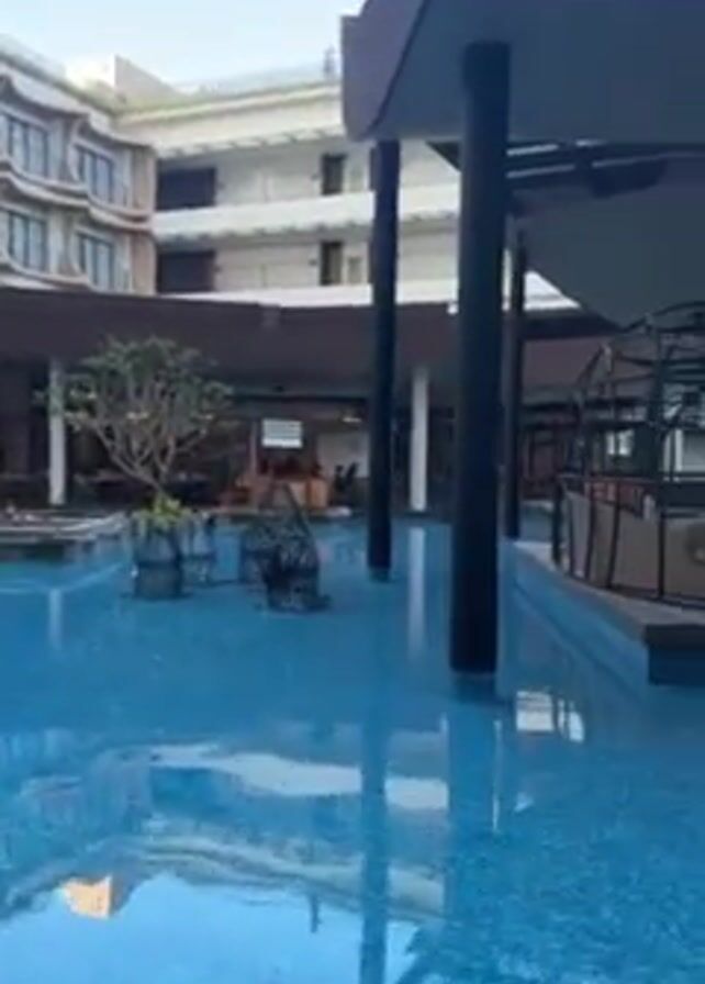 n outdoor area with a turquoise pool in the center. Surrounding the pool is an open structure with support pillars and a roof. In the pool are several decorative birdcage-like structures. Beyond the pool, there is a building with multiple levels and windows. People are visible sitting and standing in the background, under the building's overhang. The sky is light blue. The camera pans slowly across the scene.