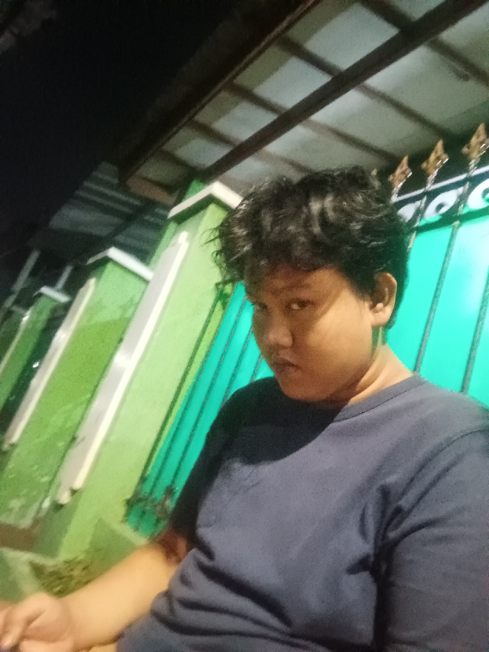 A single individual, appearing to be a young person with dark, wavy hair, is depicted in a medium-shot portrait, looking directly at the camera with a neutral to slightly stern expression. The individual wears a dark blue crew-neck t-shirt. The scene is illuminated by an artificial light source, suggesting nighttime conditions. In the background, to the left, are several light green architectural columns or pillars with white trim, indicating a building facade or a wall. To the right, a turquoise-colored metal gate or fence with decorative gold-colored elements at its top is visible. Above, a corrugated metal roof structure with visible beams can be seen. The location is in the city of Bogor, Indonesia.
