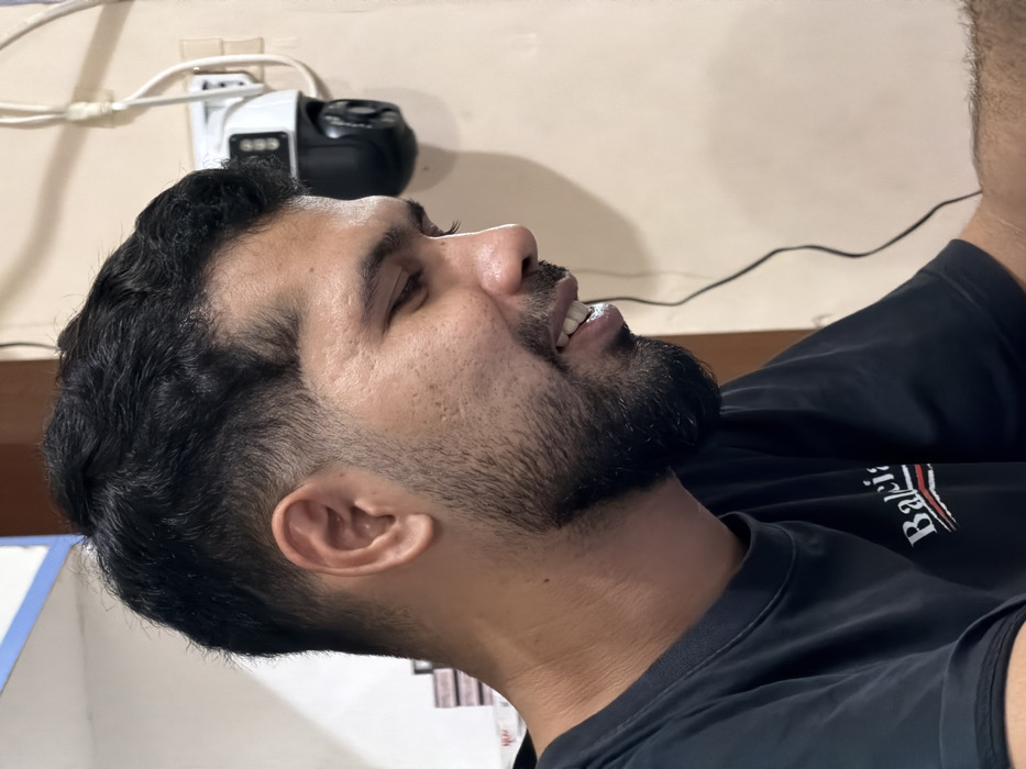 A medium close-up image depicts an adult male subject in an indoor setting