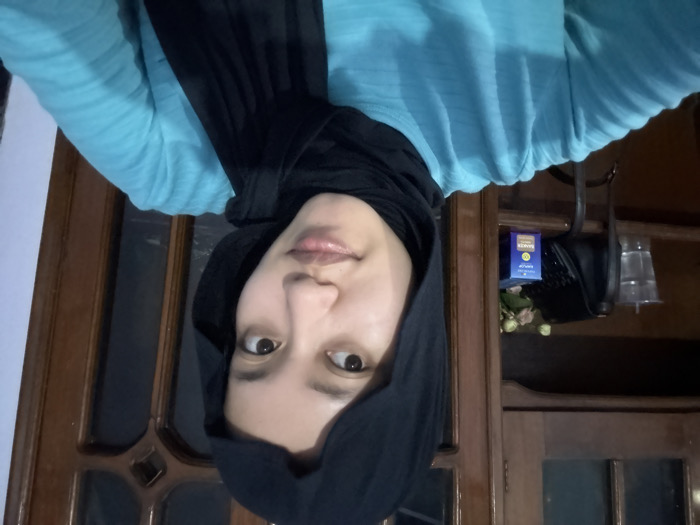 The image depicts an indoor scene in Kebonsari, Indonesia. An adult female is centered in a self-portrait, wearing a black hijab covering her head and neck, and a light blue, long-sleeved top with a textured pattern. Her gaze is directed slightly to the viewer's right. In the background, to the left, is a dark brown wooden furniture unit with a shelf. On this shelf are a clear plastic cup containing a liquid, a black shoulder bag, a small cluster of light-colored artificial flowers, and a blue and gold rectangular box labeled "EMILOP 10 SACHET". To the right of the subject, a portion of a dark brown wooden door or door frame with a glass panel is visible, adjacent to a plain, light-colored wall. The setting appears to be an interior room.