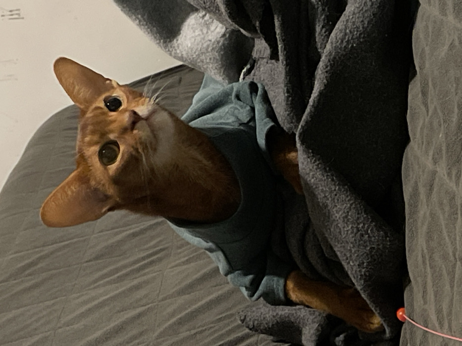 - "An orange cat with large ears peers upward from a dark gray bed" by FM-oln9s2, licensed under CC BY 4.0