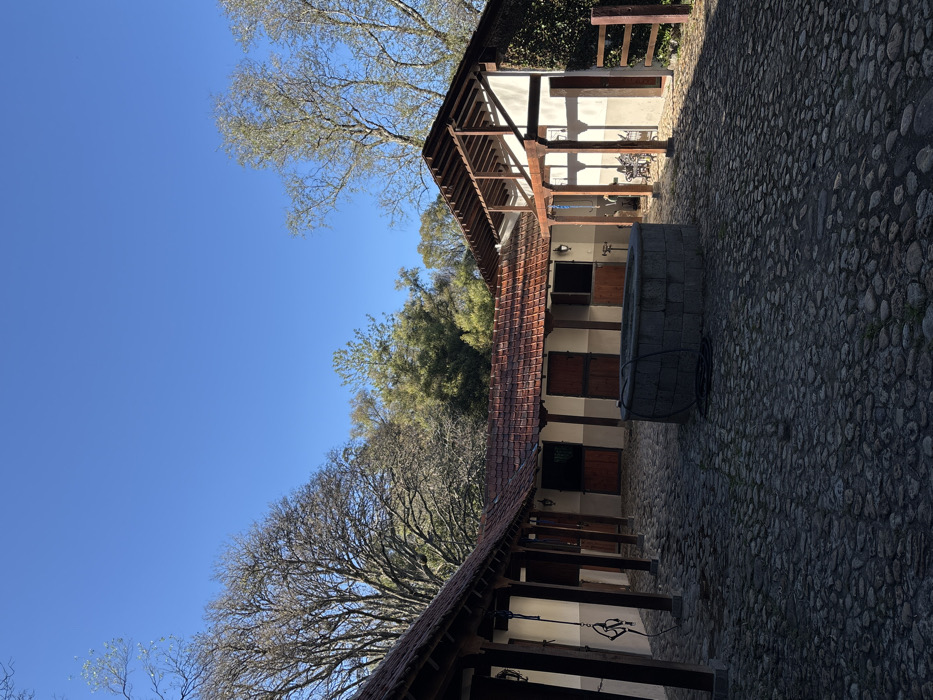 The image depicts an outdoor courtyard surrounded by rustic structures under a clear blue sky, consistent with a rural or semi-rural setting in Huasca de Ocampo, Mexico. The ground of the courtyard is paved with irregular dark grey cobblestones, showing minor wear and some sparse vegetation. Centered in the foreground is a circular well or fountain structure, constructed from stacked, rough-hewn dark grey stone blocks. A dark, coiled hose or cable is resting on the top edge of this structure. Two main building sections frame the courtyard. To the left, a single-story structure features a covered walkway supported by dark wooden posts and beams. The building has white or light beige walls and a red-tiled roof. Multiple openings are visible, some fitted with dark wooden double doors, others appearing as open windows. A horse bridle or similar tack is suspended from one of the wooden posts. Wall-mounted lights are affixed to the facade. This building extends towards the background, where additional dark wooden doors and windows are visible. To the right, a more open structure, possibly an outdoor common area or patio, is present. It has white or light beige walls and a slatted wooden roof structure supported by dark wooden beams and posts. Beneath this open section, a dark metal bench or outdoor furniture is partially visible. The far right wall of this structure is partially covered by green climbing foliage, and a short wooden fence section, composed of vertical posts and horizontal planks, extends from it. The background features numerous trees against a bright blue sky. Some trees are deciduous with bare branches, while others exhibit green foliage. The scene is illuminated by natural sunlight, casting distinct, elongated shadows from the structures and trees across the cobblestone pavement, indicating a low sun angle. No people or active subjects are visible within the frame.