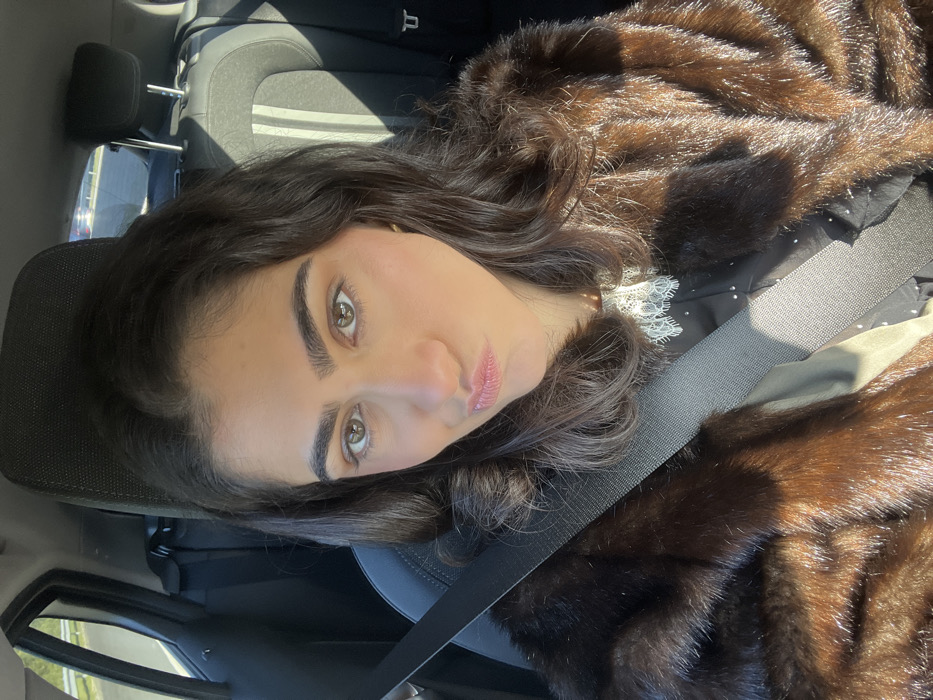 An individual is observed seated in the front passenger seat of a vehicle, located in Caminha, Portugal. The subject, an adult female with dark, wavy hair and brown eyes, is depicted looking directly at the camera with her lips pursed. She is wearing a dark brown, fur-like coat over a black garment featuring a white lace collar. A dark gray seatbelt diagonally crosses her chest. The vehicle's interior shows dark upholstered rear seats, partially illuminated by direct sunlight which casts shadows and highlights on the subject and the interior. A blurred background visible through the vehicle's rear window indicates an outdoor roadside environment with green foliage.