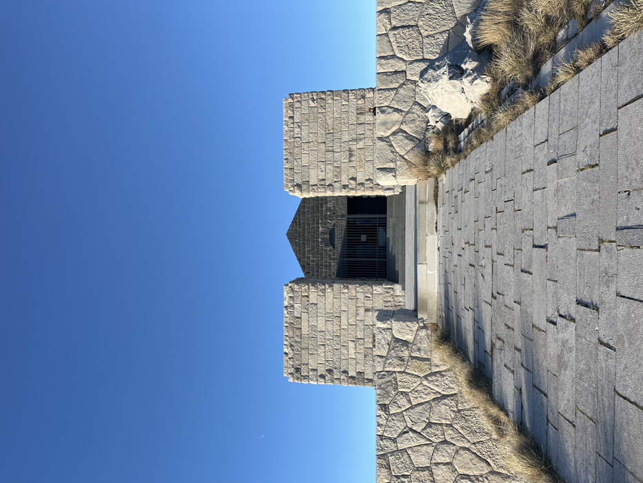 - "A stone path leads to a building with a pyramidal roof and barred windows under a clear blue sky" by FM-N8yZ02, licensed under CC BY 4.0