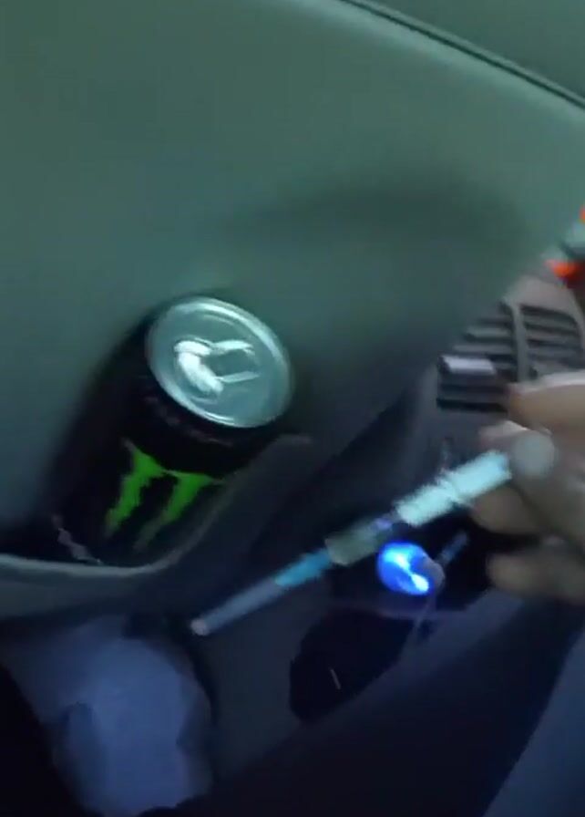 . The video shows a can of Monster energy drink and a syringe. The syringe appears to be filled with a yellowish liquid. The background is blurry, but it seems to be inside a car.