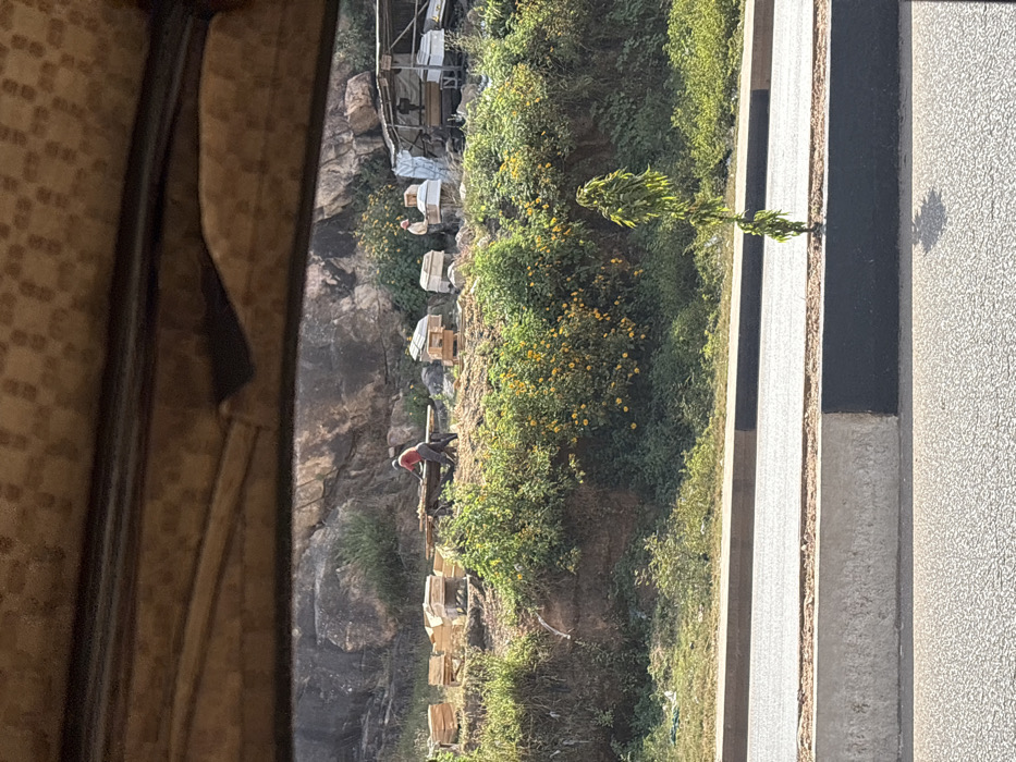The image, captured from within a vehicle, displays an apiary situated on an elevated, rocky terrain adjacent to a paved road in Unknown, Nigeria