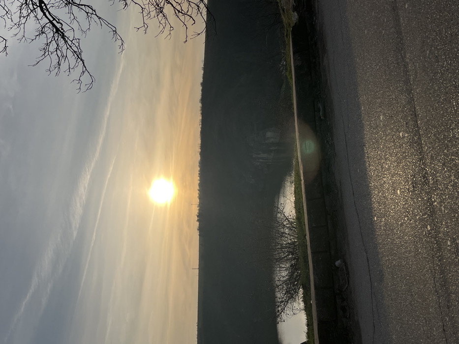 The scene depicts a natural landscape at either sunrise or sunset, likely within the Kaylaka Park area near Pleven, Bulgaria. The sun, a prominent bright yellow-orange orb, is low in the sky, positioned left of the image's center, casting a warm glow and exhibiting lens flare. The sky is partially cloudy, with cirrus clouds and faint contrails visible against a gradient of pale orange near the horizon, transitioning to light blue overhead. In the immediate foreground, the upper surface of a dark asphalt road is visible, showing minor cracks and patches, illuminated by the low sun. A low, dark stone retaining wall separates the road from a steep drop-off. A small piece of light-colored debris is on the ground near the base of this wall. Beyond the retaining wall, a deep, vegetated valley or gorge extends downwards. A body of water, consistent with the Vit River, is situated at the bottom of the gorge, reflecting the sky's brightness. The slopes of the gorge are densely covered with dark, bare deciduous vegetation. Prominent light-colored rock formations or cliffs are visible on the opposite side of the water. The distant horizon features a continuous line of dark, heavily vegetated hills, with a few indistinct vertical structures, possibly communication towers or pylons, barely discernible against the sky. The bare, skeletal branches of a tree are visible in the upper right quadrant of the frame. No individuals or vehicles are present in the image.