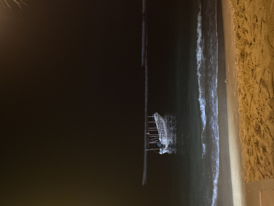 This forensic description details a nighttime beach scene in Rumassala, Sri Lanka. The image captures a dark, tranquil environment. The foreground reveals a sandy beach, illuminated by a strong artificial light source positioned off-frame to the lower left, casting a horizontal beam across the sand. The sand texture and some minor indentations are visible. At the immediate water's edge, gentle waves break, creating white foam. A small, light-colored object rests on the sand, right of the central axis. In the mid-ground, a white motorboat, identified by the blue text "SUN DIVING" on its hull, floats stationary on the dark water. The boat is equipped with a canopy structure supported by poles and an outboard motor at its stern. Two small flags or pennants are visible near the front of the canopy. The water around the boat shows subtle ripples and reflections. The background consists of an undifferentiated black expanse, indicating the night sky and distant ocean with no discernible horizon or land features. No individuals are present in the scene, and no overt actions or interactions are depicted.