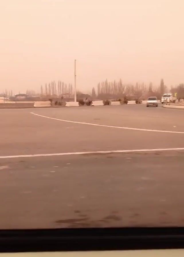 view from inside a vehicle moving on a road, likely in a dusty or hazy environment, judging by the orange-tinted sky and the overall muted colors