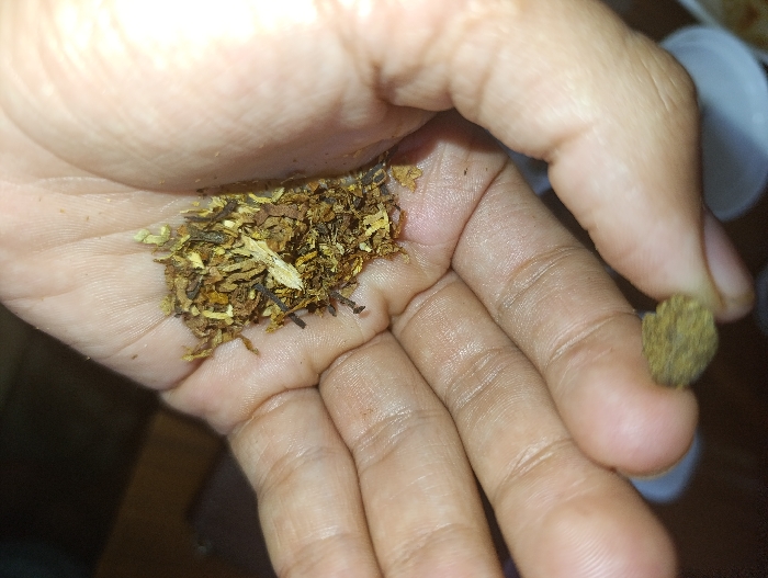 A close-up photograph displays an adult human hand, exhibiting a medium skin tone, holding two distinct substances