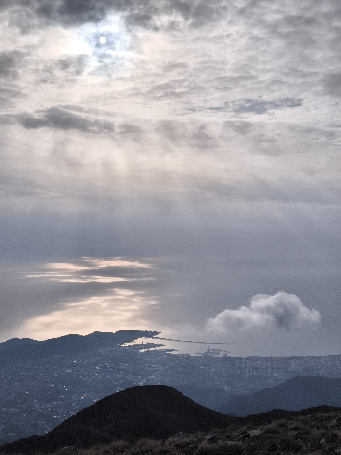 This panoramic image, captured from a high elevation in Mali Mikulići, Montenegro, presents a vast coastal landscape under a heavily clouded sky. The sun, a bright white disc, is partially obscured by dense grey and white clouds in the upper left, casting diffuse light and faint crepuscular rays downward into the atmosphere. Beneath the clouds, the sea reflects elongated streaks of sunlight, indicating a surface interaction with direct light. A prominent coastline features dark, undulating hills and peninsulas, framing a sprawling urban area with discernible buildings and infrastructure, including a significant port facility with docks and cranes on the right side of the main bay. A singular white cumulus cloud hovers independently above the cityscape in the mid-right. The immediate foreground shows the dark, rugged silhouette of a mountain ridge, from which the photograph appears to have been taken. No individuals are present in the scene.