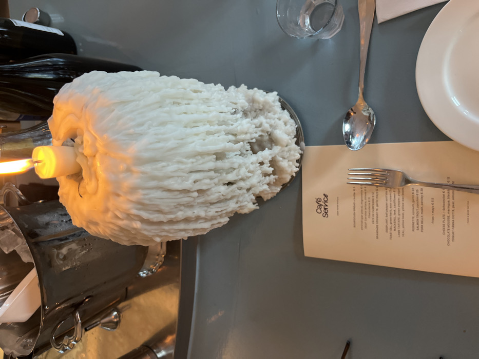 This image depicts a table setting inside Café Service, located at Lange Koepoortstraat 12, 2000 Antwerpen, Belgium. A prominent, actively burning white pillar candle, extensively covered in solidified white wax drippings, occupies the center of the frame, emitting a yellow flame. In the upper left, a silver ice bucket containing ice and a white scoop is visible on a reflective surface. Partially visible dark-colored wine bottles are present in the upper right background. The table features a two-toned surface, primarily grey-blue. A cream-colored menu, labeled "Café Service," is laid open in the mid-foreground, displaying a list of food items and prices, including "SOURDOUGH BREAD + butter € 5" and "OYSTER (per piece), mignonette € 4." A silver dining fork rests vertically on the menu, while a silver spoon is positioned horizontally to its right. An empty, clear, faceted drinking glass and a segment of a white ceramic plate are visible in the lower right foreground. No individuals are present in the scene.