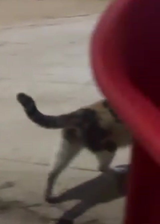 A calico cat walks on a cracked tile surface. The video pans to a red plastic chair with the Coca-Cola logo.