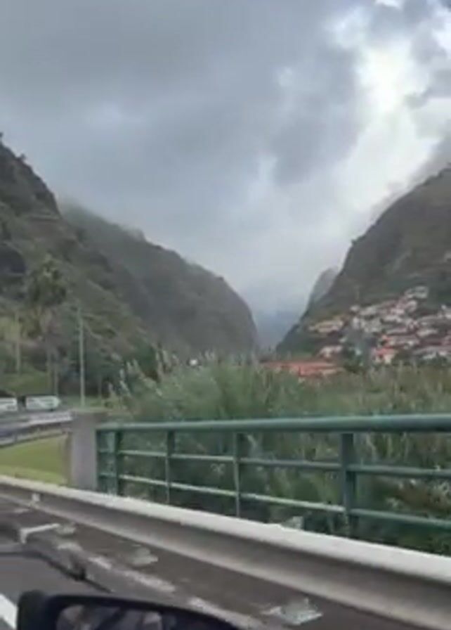 view from inside a car driving along a highway with mountains and a small village on either side. The sky is overcast with some patches of blue visible. The road has a green guardrail. There are utility poles and various plants along the roadside.