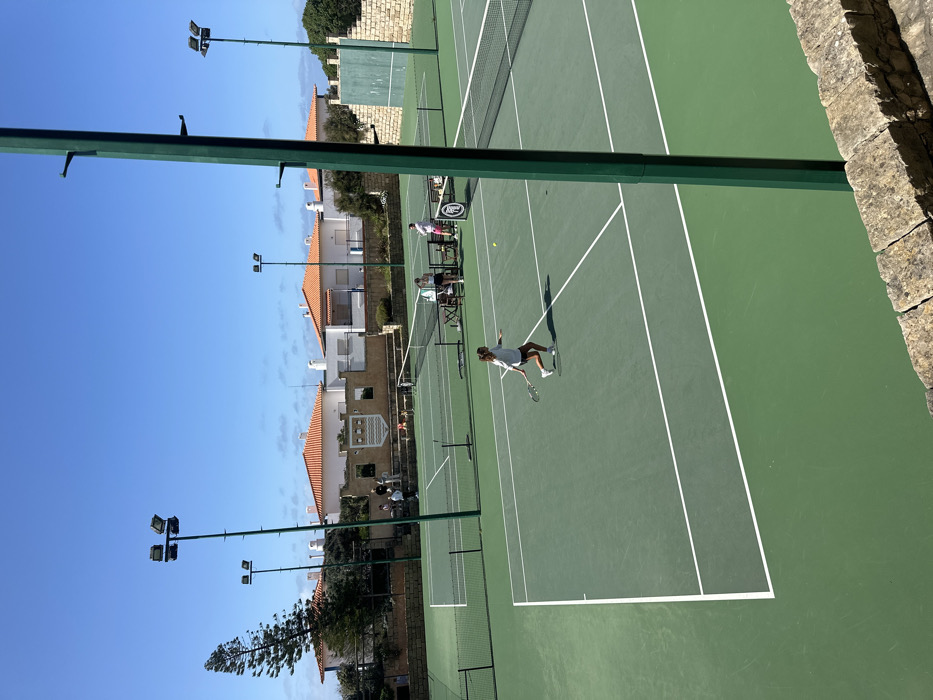 This image depicts an outdoor tennis facility located in Ericeira, Portugal, under a clear blue sky