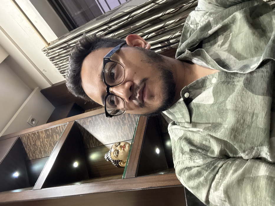 An upward-angled, medium-shot portrait captures a male subject indoors in Kolkata, India. The individual, appearing to be in his 20s or 30s, possesses dark hair, a short beard, and a mustache. He wears black-framed eyeglasses with a subtle metallic lower rim and a muted green/grey patterned collared shirt with white buttons. His gaze is directed upwards and to the viewer's left. The background features a dark wooden shelving unit with integrated circular spotlights, illuminating a Buddha head statuette positioned on a glass shelf. To the right of the subject, heavy, textured curtains in a metallic brown hue are visible, drawn back. The lighting is warm and indirect, highlighting the subject and parts of the background.