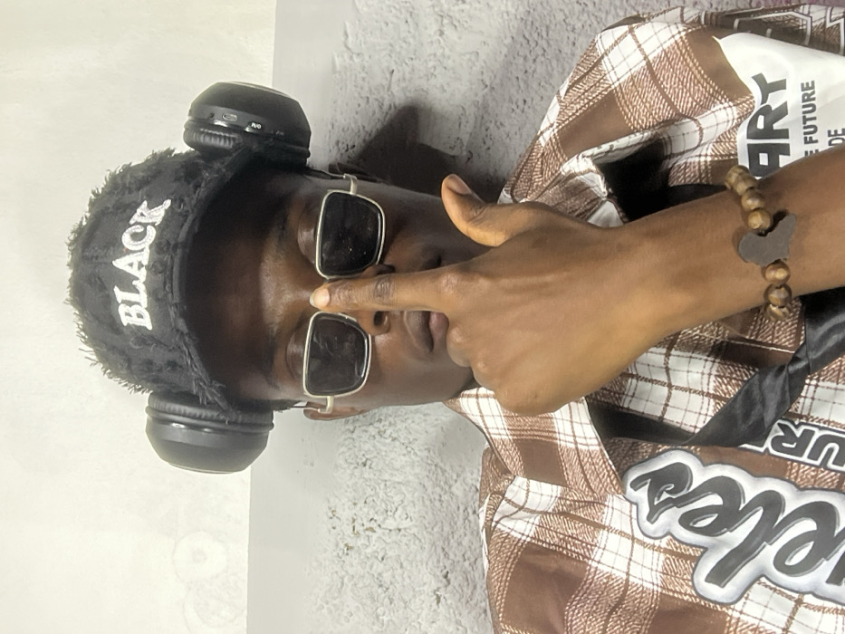 An individual is depicted from the upper torso upwards, situated indoors or in a shaded area against a plain, light-colored, possibly textured wall in Bar Gada, Nigeria. The person, appearing to be male with a dark complexion, wears a black fuzzy baseball cap with the word "BLACK" embroidered in white on the front. Black over-ear headphones are positioned over the cap, covering the ears. Square-framed sunglasses with dark lenses and thin metallic frames rest on the bridge of the nose. The individual's right index finger is placed vertically against the center of the sunglasses. A brown and white plaid short-sleeved shirt is worn, with a black strap or bag visible over the left shoulder. A beaded bracelet with a dark, Africa-shaped charm is on the left wrist. The individual looks directly towards the viewer.