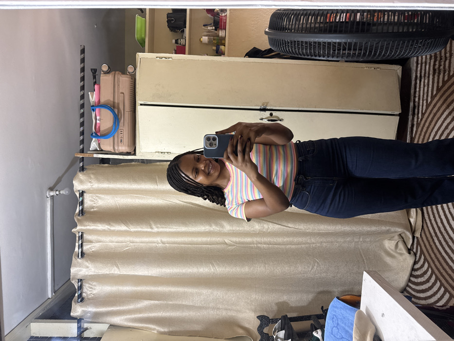 The image depicts a young female individual taking a mirror selfie in what appears to be an indoor residential setting. The female subject, positioned centrally, has dark skin and black braided hair, styled to fall over her shoulders. She is smiling directly at the camera. She wears a horizontally striped short-sleeved crop top featuring pastel colors (pink, yellow, blue, green, white) and dark blue high-waisted jeans. Both hands hold a dark-colored smartphone, fitted with a light-colored protective case, capturing her reflection. To her immediate right, a black floor-standing electric fan is visible. To her left, a white table or shelf is partially present, bearing a light brown item and a blue towel. Further left, a dark-colored shoe rack with two shelves holds light-colored footwear. The background, as reflected in the mirror, consists primarily of light beige, drawn curtains on the left and center, suspended from a dark curtain rod. To the right of the curtains, a light-colored, two-door cabinet or wardrobe is present, with its left door slightly ajar. Perched atop this cabinet is a light brown, hard-shell suitcase equipped with wheels and a blue strap. Adjacent to the cabinet on the right, an open shelving unit displays various bottles, containers, and a dark bag, suggesting personal care items. Above the curtains and cabinet, an exposed LED bulb light fixture is mounted on the ceiling. The floor is covered by a circular rug featuring concentric brown and beige stripe patterns. No discernible visual cues within the image provide specific identification of the location as Dar es-Salaam, Tanzania.