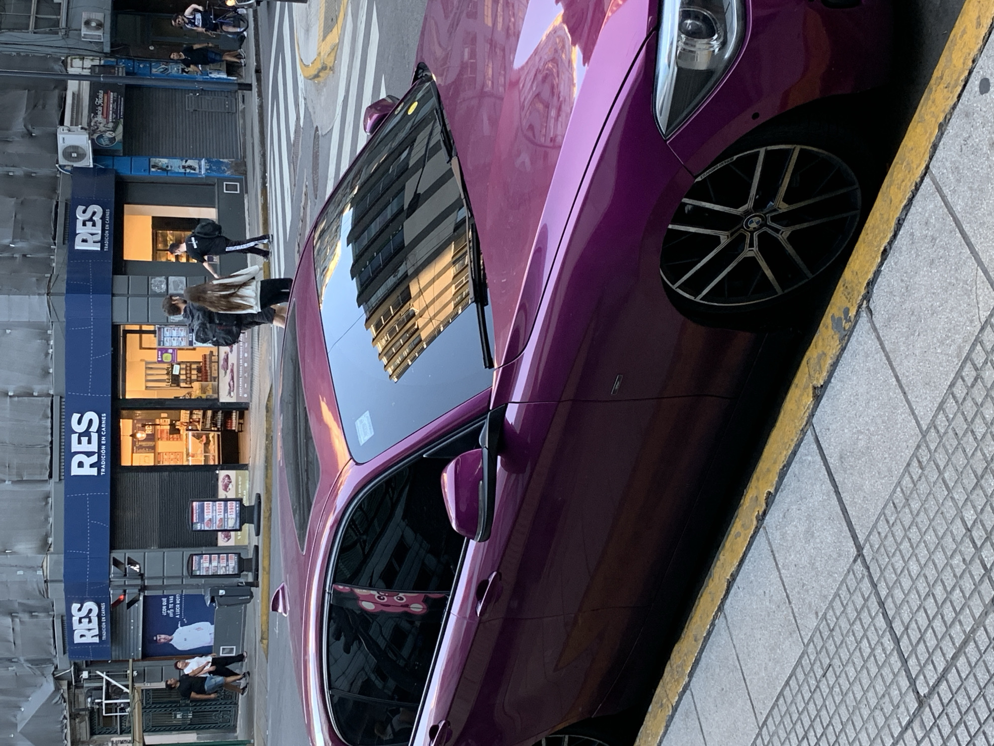 A custom-painted, dark purple BMW 1 Series hatchback is parked curbside on a city street in Buenos Aires, Argentina, next to a chipped yellow curb and grey tiled sidewalk