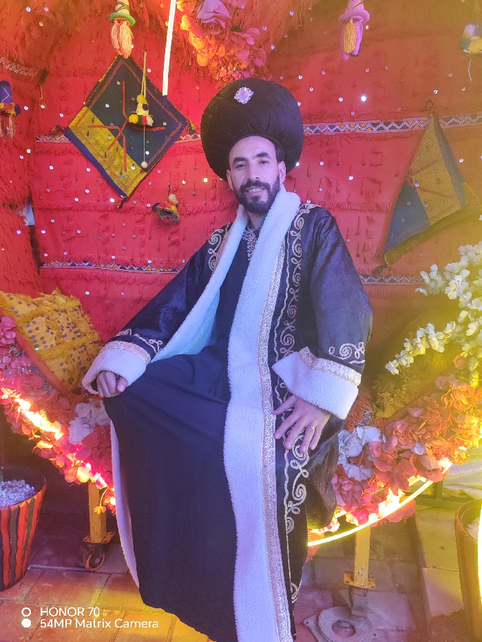 A man wearing a black and gold embroidered robe with a white fur trim and a large black hat poses against a decorated backdrop. The backdrop includes red fabric with sequins, colorful hanging ornaments, decorative pillows, and flowers. The man has a beard and a slight smile. A phone watermark is visible in the bottom left corner.