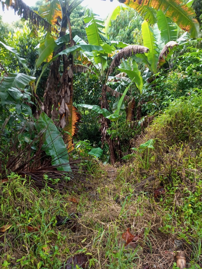 A narrow path leads through a lush, tropical landscape. Banana trees with vibrant green leaves and dried brown sheaths dominate the scene. Dense foliage and various plants surround the pathway. The ground is covered in tall grass, dried leaves, and a scattering of debris. The path disappears into the thick greenery, suggesting a hidden or wild area.