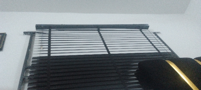 This image depicts an indoor scene in Tuaniako, Nigeria, captured from a low angle. A window, centrally located, is fitted with black horizontal Venetian blinds. The upper section of the blinds has its slats angled upwards, allowing ambient light to pass through and revealing a lighter background. The lower section of the blinds remains closed, with slats angled downwards, presenting an opaque, dark surface. A white pull cord for the blinds is visible on the left side. To the immediate left of the window, a dark-framed object, consistent with a picture or mirror, is partially visible on a white wall. In the bottom right foreground, a portion of dark, possibly upholstered, furniture is present, featuring two distinct horizontal golden-yellow stripes. No individuals are depicted within the frame. The environment consists of white walls, illuminated by diffuse light originating from the window.