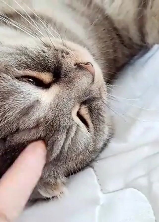 close-up of a tabby cat sleeping on a white quilted surface. A finger gently touches the cat's face. The cat's eyes are closed, and its whiskers are visible. Background sounds consist of people talking.